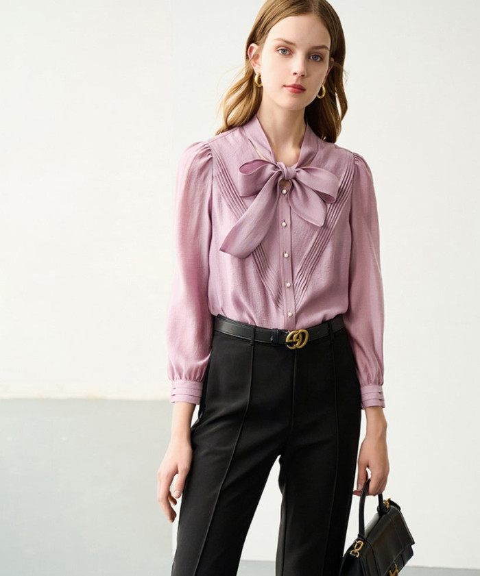トレンドのリボンタイと、トレンドカラーのパープルでデザインされていて、トレンディーなフェミニンスタイルを作ることができるリボンタイブラウス。リボンタイは可愛らしく、甘い印象を演出しがちですが、直線のタックデザインやスマートなシルエットが大人っぽく着用させてくれるのです。