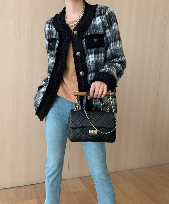 ドーリーさとフェミニンさを兼ね備えた、チェック柄のツイードジャケット。モノトーンで引き締めつつ、ゴールドのボタンが高級感を与えてくれるので、ワンランク上のフェミニンスタイルを作ることができます。また、カジュアルなアイテムにも似合う万能さなので、プラスワンしてほしいアイテムです。