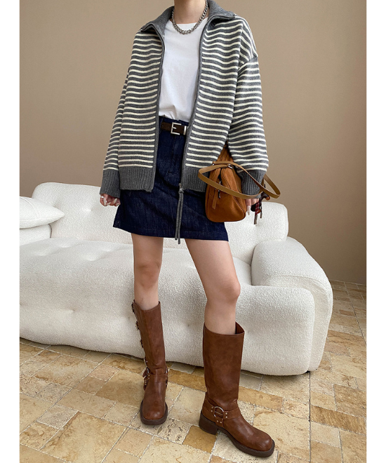 ボーダー柄のニットカーディガン。ダブルジッパーがアクセントになっています。ミニスカートやブーツを合わせて、スタイリッシュにコーディネート。