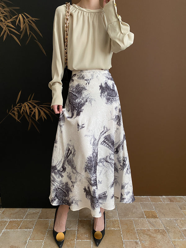 ラウンドネックとルーズなドレープが女性らしい柔らかさを演出するベージュブラウスは、どんな柄物スカートとも好相性。ゆったりとしたシルエットながら、上品な落ち感でだらしなく見えず、全体をきれいめにまとめてくれます。ベージュの柔らかい色味がスカートの柄を引き立てつつ、華やかすぎず大人っぽさをキープしてくれますね。