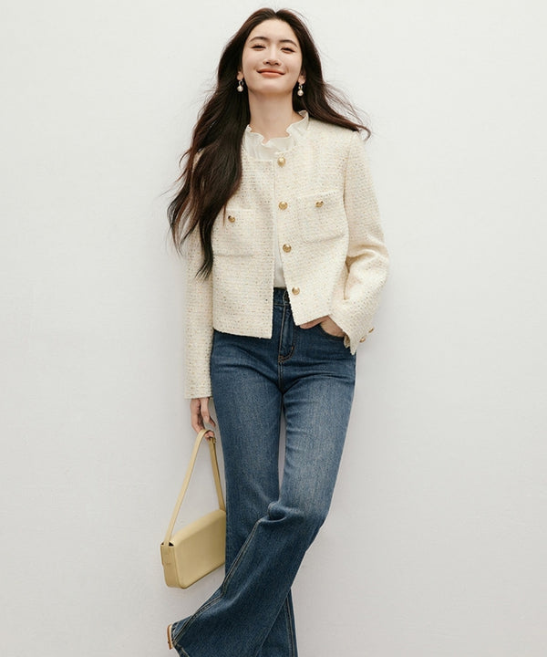 ツイード素材のノーカラージャケットは、顔まわりをパッと明るく見せてくれる上品アイテム。きちんと感のあるジャケットも、デニムパンツと合わせればほどよくカジュアルダウンでき、休日のきれいめカジュアルスタイルにもぴったりです。