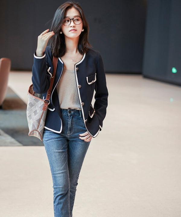 清潔感あふれるパイピングノーカラージャケット