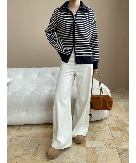 ネイビー×ボーダーのコンビで爽やかさをキープしつつ、ニット素材でぬくもりも感じられるカーディガン。日常に気負わず着られるカジュアルさがありながら、メリハリを効かせたホワイトとの色合わせでルーズになり過ぎない。ダブルジッパーも使いやすそうですね。