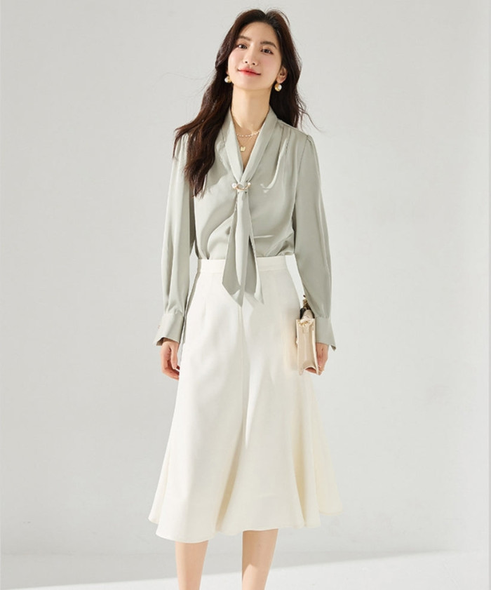 大人っぽい上品なくすみグリーンが可愛らしく、サテン生地で女性らしい雰囲気を演出してくれるパールボタンのブラウス。ブルー、グリーン、ホワイトの3色展開で、どの色も爽やかさと洗練されたフェミニンなイメージを演出してくれます。デコルテがすっきりと綺麗に魅せてくれるVネックも嬉しいです。