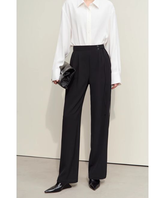 ウエスト部分が巻きスカートのようなデザインになっており、タックインをするとコーディネートにアクセントを添えてくれるデザインタックパンツ。ダークカーキとブラックの2色展開で、いずれもシンプルに合わせられます。ストレートのシルエット+ハイウエストで詩を細く長く見せられます。