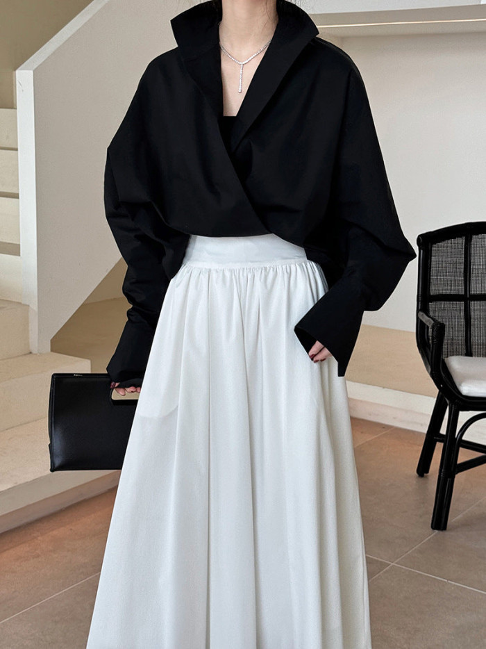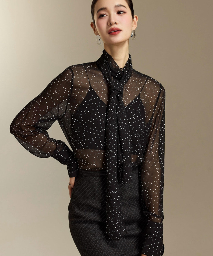 シアー素材にクラシックなボウタイを組み合わせた、辛口と女性らしさの絶妙ミックス。黒でも抜け感が出て、動きに合わせて軽やかに揺れる質感が魅力です。ジャケットのインにも映え、1枚で“特別感のあるブラックスタイル”が仕上がります。