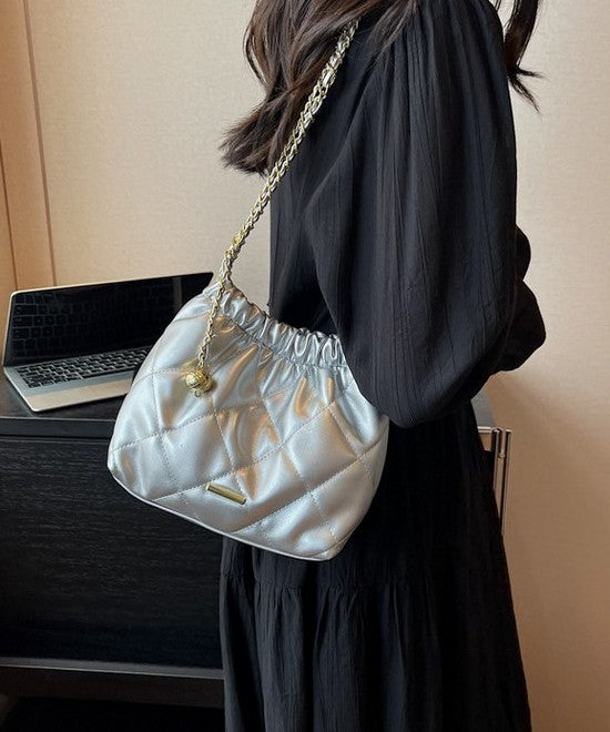 ワンポイントのチェーンが光を受けてきらりと輝き、夜のシーンで抜群の存在感を発揮。バッグ自体は上品で落ち着いたデザインなので、派手になりすぎず“ほんのり艶っぽい”大人の魅力が引き立ちます。いつものコートに合わせるだけで特別感がアップ。