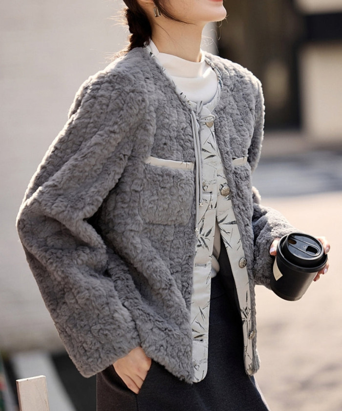 大人っぽいシックグレーを用いたもこもこ生地×フェミニンな印象のあるナチュラル模様をプリントした前立てのドッキングデザインが、たまらなくおしゃれな印象にしてくれるジャケット。生地のドッキングだけでもおしゃれですが、ゴールドのボタンがさらにおしゃれでフェミニンな印象にしてくれます。