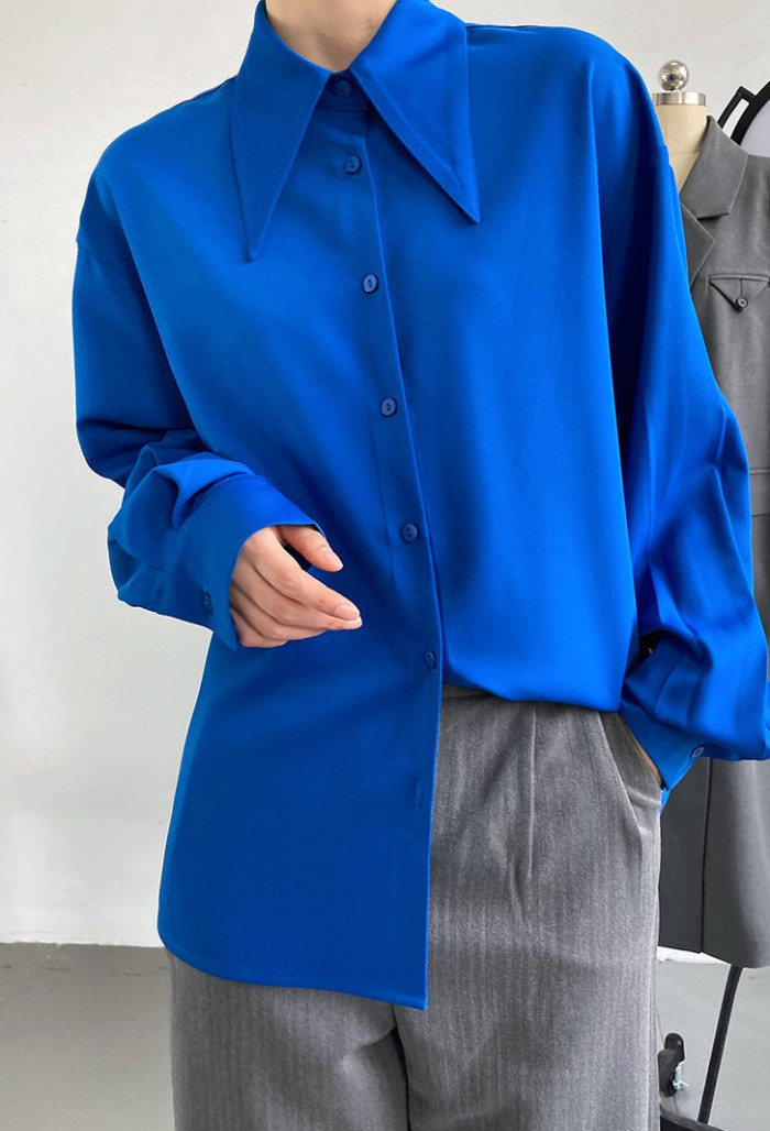 非常に鮮やかで目を惹くブルーの色味が印象に残るドレープシャツ。シンプルなデザインのシャツだからこそ、綺麗に色味が映えて印象も強くなりますよね。鮮やかな色味は大人女子さんが最も得意とする分野で、大人女子さんの持つ上品さが、派手で大胆なビビッドカラーをワンランク上に昇格させるのです。