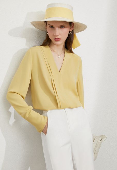 Vネックの襟デザインがデコルテをすっきりと見せてくれて、シンプルだからこそスマートに見せてくれるVネックブラウス。フレッシュなイメージのあるイエローカラーですが、スマートなデザインのアイテムなので大人っぽさを両立させることができます。着回しの効きやすい優秀なアイテムでもあります。