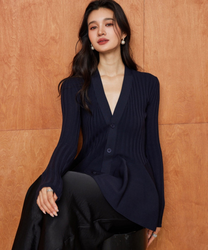 - 【50代60代】体型カバーも叶えるペプラムVネックニットカーディガン