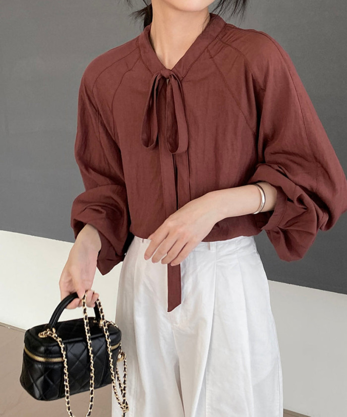 クラシカルなレッドカラーが大人なレディに。リボンタイブラウス