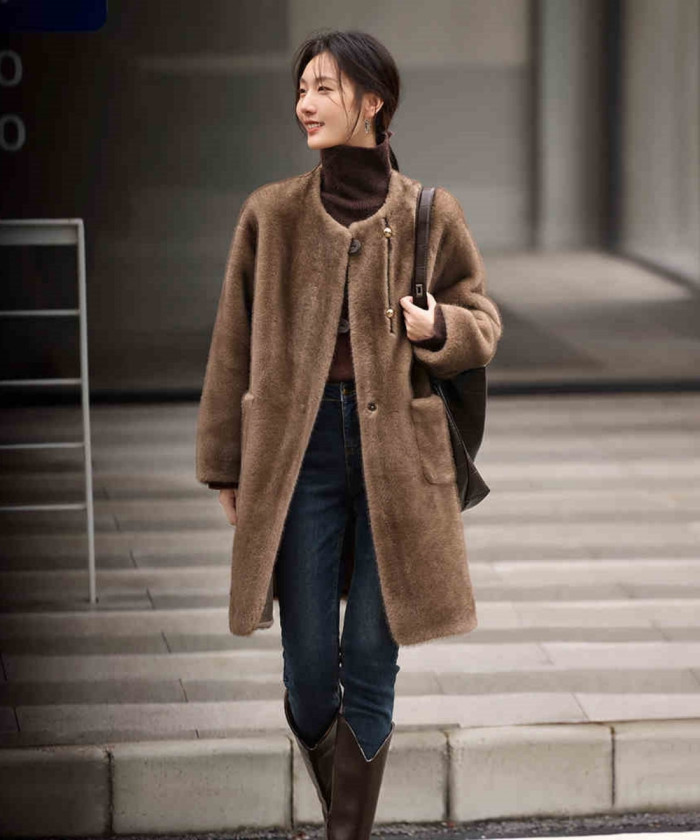 柔らかいモコモコ素材が愛らしく、ブラウンの深みが大人らしさを引き立てます。ノーカラーデザインだからマフラーやストールとも合わせやすく、タートルやハイネックとも好相性。シンプルな服に羽織るだけで冬らしいあたたかなムードに。
