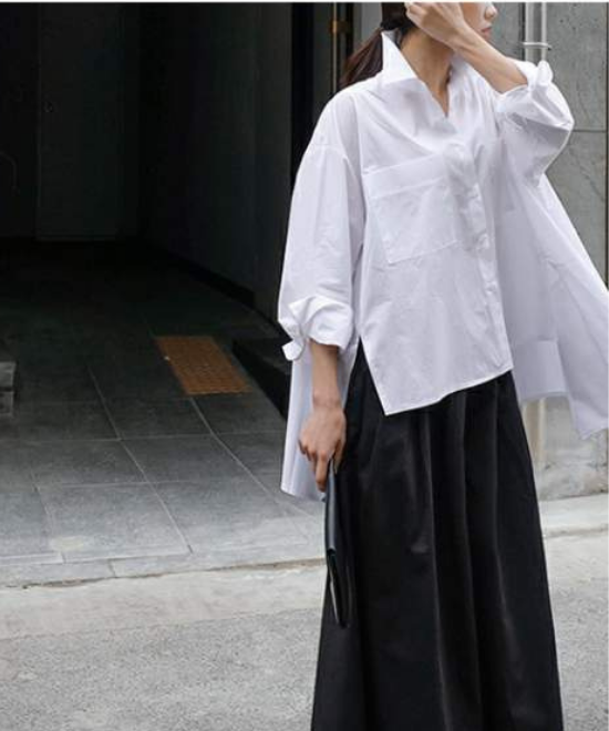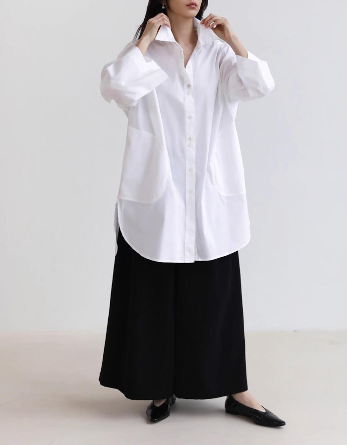 シンプルな無地シャツも、オーバーサイズを選べば途端にこなれ感がアップ。ボタンを少し外してインナーを覗かせたり、袖を軽くまくってラフに着こなして。パンツやスカート、どちらにも合わせやすい万能アイテムです。