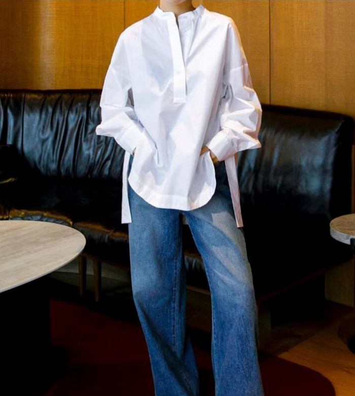 スタンドネックデザインで、より抜け感が際立つ大人のシャツ。プルオーバータイプなので、ふわっと着るだけで旬顔に。ロングスカートやタックパンツを合わせて、ゆるさと女性らしさを両立した着こなしに仕上げて。