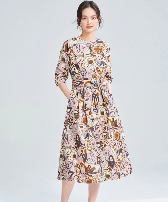 ピンク地にグラフィカルプリントが華やかなワンピース。柔らかなニットのカーディガンと組み合わせれば、ワンランク上の洗練されたフェミニンコーデを楽しめます。