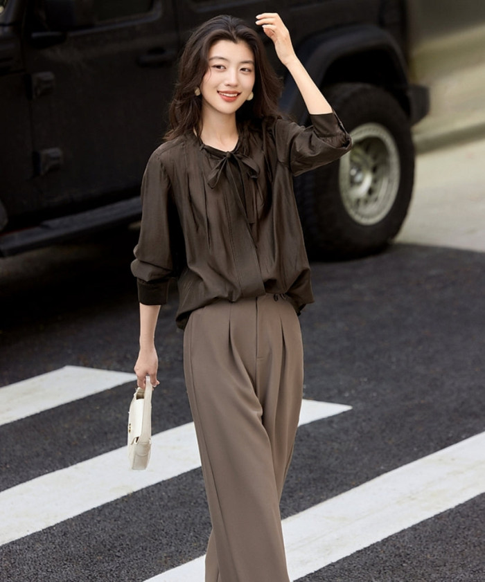 優雅でエレガントな雰囲気を演出してくれる、ダークブラウンが特徴的なリボンタイブラウス。1枚で非常に印象のあるアイテムなので、ボトムスには何を合わせてもワンランク上のコーディネートが完成します。同じブラウンの色味でスタイリングをまとめて、グラデーションコーデにするのもありです。