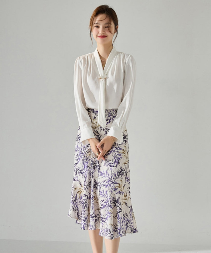 洗練された印象で清楚なフェミニンスタイル。ボウタイブラウス