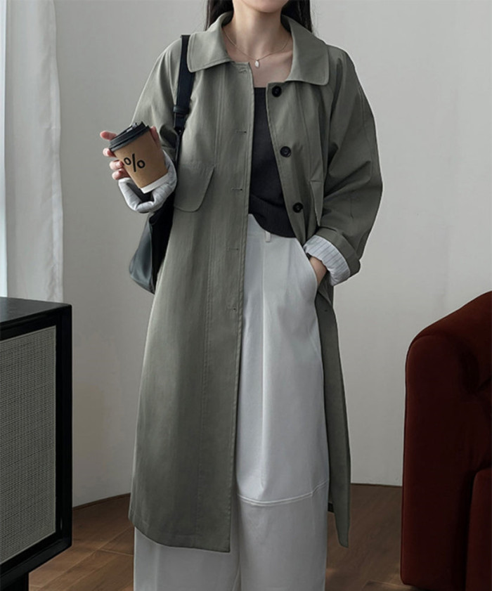 グリーンのニュアンスカラーが、おしゃれでモダンな雰囲気を演出してくれるロングコート。肌寒いこの季節に使い回せる厚みで、冬本番の時は中に着る服を厚着にすれば着回すことができます。気取らずにナチュラルにおしゃれに見せてくれる色味なので、ラフなスタイルでもサマに見せてくれます。