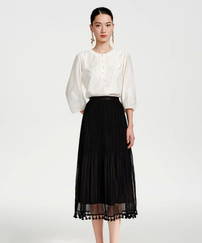 繊細に施された刺繍が美しい。刺繍入りノーカラーブラウス