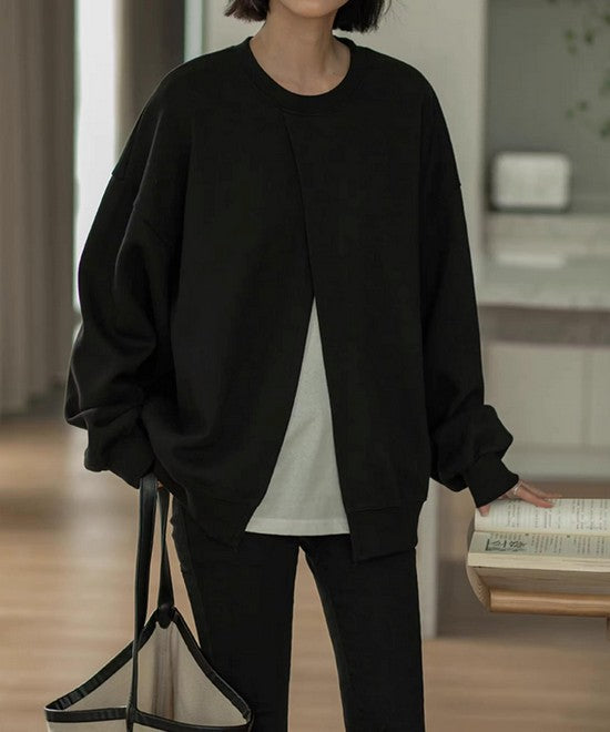 ノーカラーで丸みのあるシルエットが女性らしいスウェットですが、フロントにはスリット入りでこなれ感たっぷり。スリムパンツとの相性が抜群で、ショートブーツとも好バランス◎ 。シンプルなパンツスタイルにさりげないアクセントが欲しい人に。