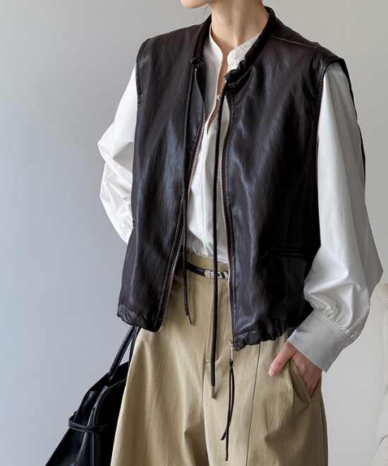 チョコレートのようなこっくりダークブラウンが魅力のレザーベスト。リボンタイを結べば甘さがプラスされ、女性らしい雰囲気で着こなせますよ。