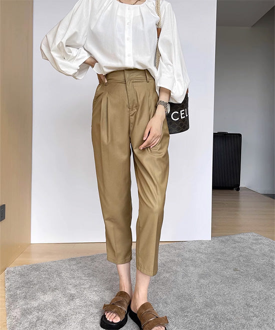 裾口にかけてゆっくりすぼんでいくのが特徴的なテーパードパンツ。テーパードパンツは、通常くるぶしが出るような丈感でデザインされているので、自転車に乗ると履くのを控えるヒールよりもフラットなパンプスの方が綺麗に履けたりします。ビジネスシーンにふさわしいきちんと感がありますよね。