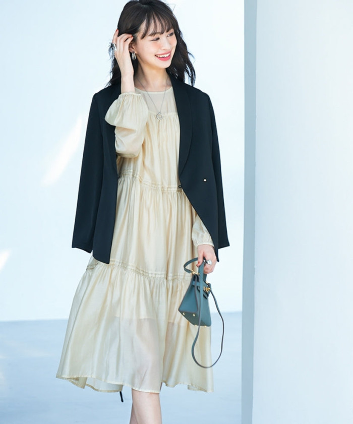 ティアードのディテールデザインが可愛らしく、ロマンティックな雰囲気を演出してくれるティアードワンピース。やや透け感もあって、トレンドのシアー感を感じられるのもさりげなくおしゃれに感じさせるポイントです。引き締まる色味のジャケットアイテムを合わせると、メリハリがついて大人っぽくなります。