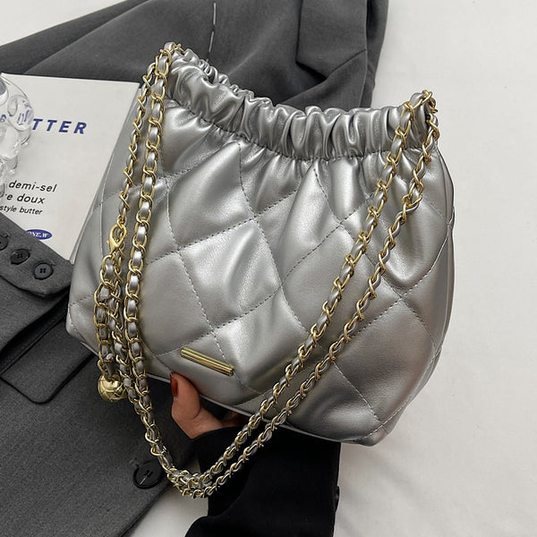 チェーンストラップが大人っぽい印象を与える一方で、巾着のような開口部のデザインと大きめのキルティングパターンがキュートなショルダーバッグです。パーティーにも対応可能の小ぶりサイズながら、マチがあることで見た目よりも容量が大きいのが嬉しいですね。