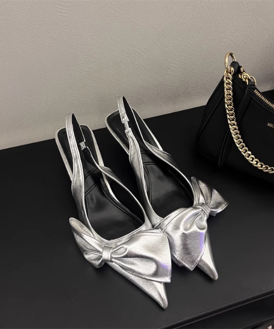 デイリーシューズとしてもお馴染みのミュールを、ポインテットトゥとシルバーカラーでフォーマルに仕上げた1足。ドレスの軽やかな素材ともマッチしそうですね。ゴージャスな印象ながらも高過ぎないヒールと大きなリボンモチーフが抜けを作り、どこか親しみやすい。