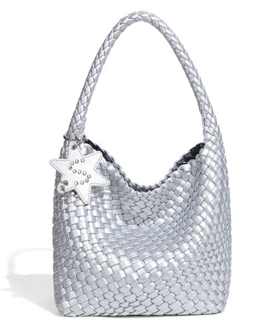 ナイトシーンでも目立てそうな明るいシルバーのハンドバッグ。持ち手が少し長めで、ショルダーバッグとしても使用可能。ストラップを付けずとも2WAYで使えるのが嬉しいですね。カゴバッグのような手織テクスチャとスタイリッシュな色味とのギャップが目を惹きます。