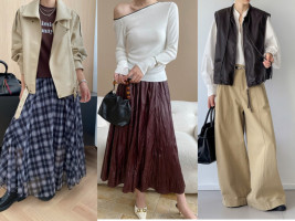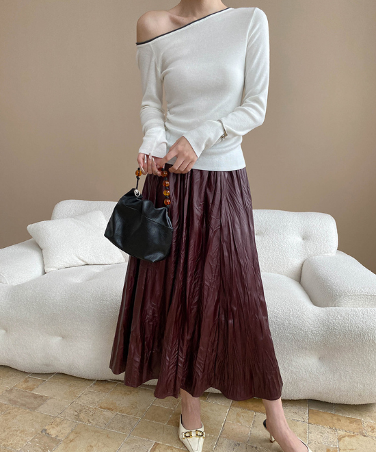 渋みのあるレッドカラーがレディライクでハードな印象で、スタイリングをかっこよく引き締めてくれるレザーのスカート。レザーはピンとしていてハリがあるイメージですが、その印象とは反対にしわ感やプリーツ感を持って履けるので、カジュアルな着こなしにもぴったり合うのです。様々な雰囲気を楽しみましょう。