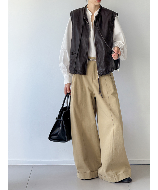 渋みのあるダークなブラウンカラーが、コーディネートを引き締めてくれるレザーのベストジャケット。寒すぎない季節はもちろん、寒い季節でも暖房のついたショッピングモールなどでは程よいアウターとして活躍してくれます。また、ノースリーブなので、抜け感が出て非常におしゃれな雰囲気にしてくれますよ。