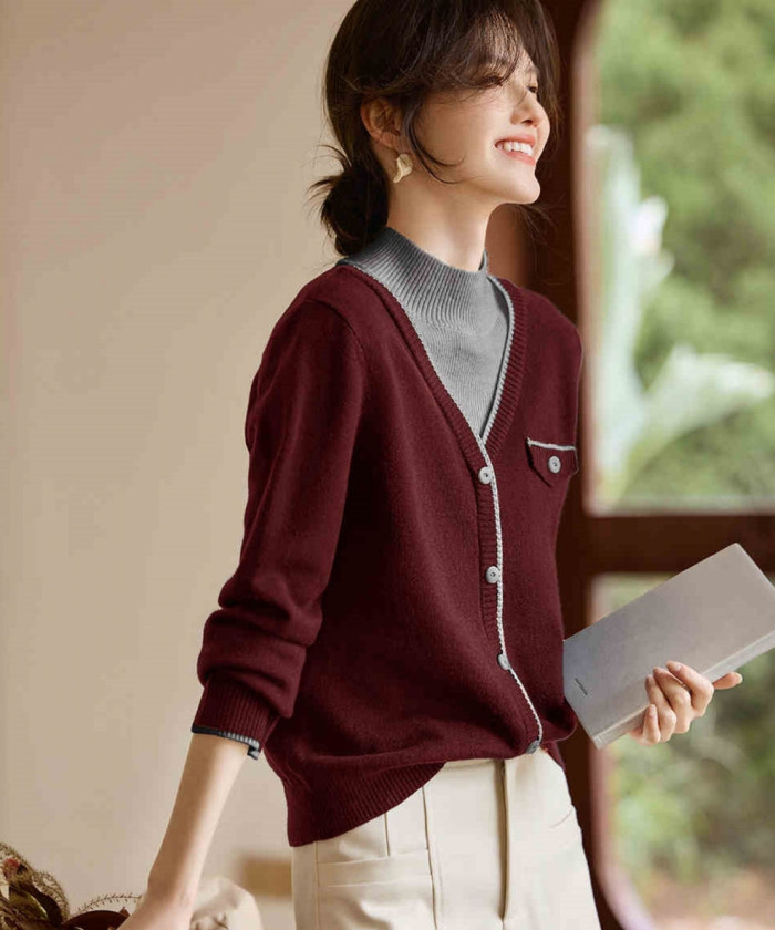 ボルドー×グレーのコントラストが洗練された印象をつくるフェイクレイヤードニット。重ね着風のデザインのおかげで、一枚でスタイリングが完成する手軽さが魅力です。シンプルなボトムに合わせるだけで“こなれて見える”便利な一枚。