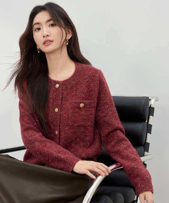 花模様がふんわり浮かぶような表情豊かな糸を使ったボルドーカーディガン。深い色味でも重たく見えず、優しい華やかさを与えてくれます。羽織としてもトップスとしても使える万能デザインで、普段のコーデをぐっとクラシカルに格上げ。