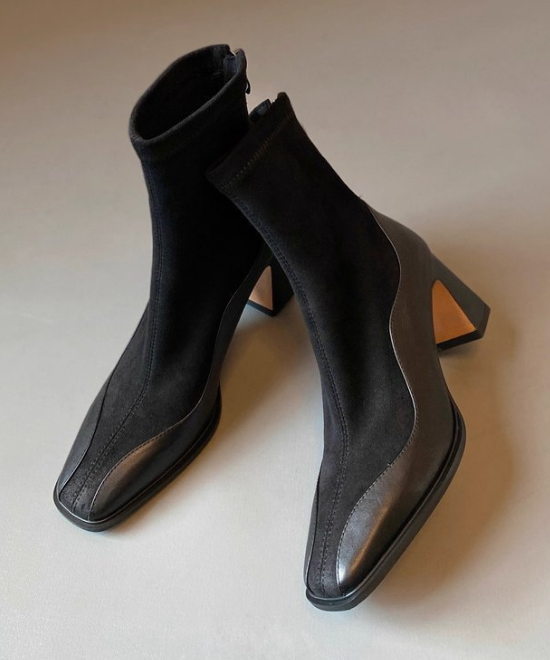 スクエアトゥの端正なシルエットながらも、異素材を組み合わせることで遊び心が感じられるショートブーツ。スエードのぬくもりとレザーのハードな質感、この温度差のある組み合わせがかえっておしゃれですね。異素材によるメリハリで足先もすっきり見えて嬉しい。