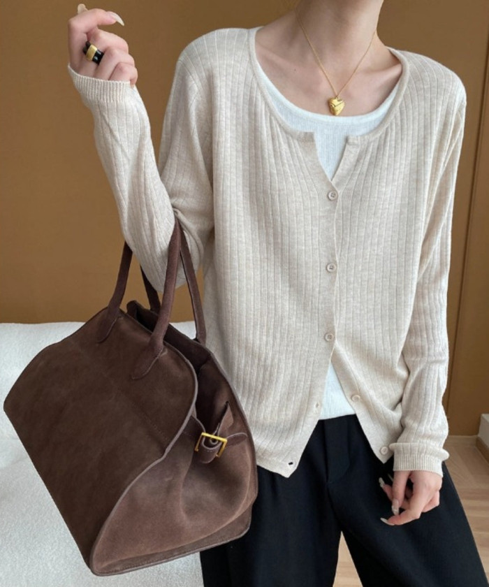 細リブとコンパクトなシルエットで、身体を華奢見えさせつつ品よく整えてくれる1枚。羽織りとしてはもちろん、ボタンを留めてトップス風に着ても◎。柔らかなベージュは肌馴染みが良く、アクセやスカートを合わせると"控えめだけど印象に残る"大人フェミニンが叶います。