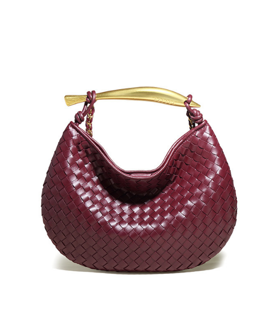 コーディネートの差し色に使えるバーガンディのハンドバッグ。レザー調のテクスチャーとゴールドの持ち手部分で高見えな雰囲気。オールブラックのスタイルにアクセントとして持てばこなれたスタイルに。