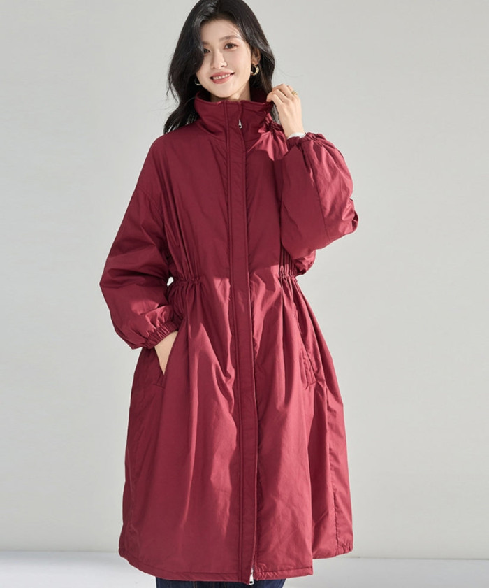 落ち着いたトーンで、ナチュラルな雰囲気を演出してくれるレッドカラーが美しい、1枚で主役級のロングダウンコート。ロング丈のコートは、そのシルエットやボリューム感からワンピースのように1枚メインで着用するようになります。もちろん、前を開けて中を見せながらメリハリをつけても◎