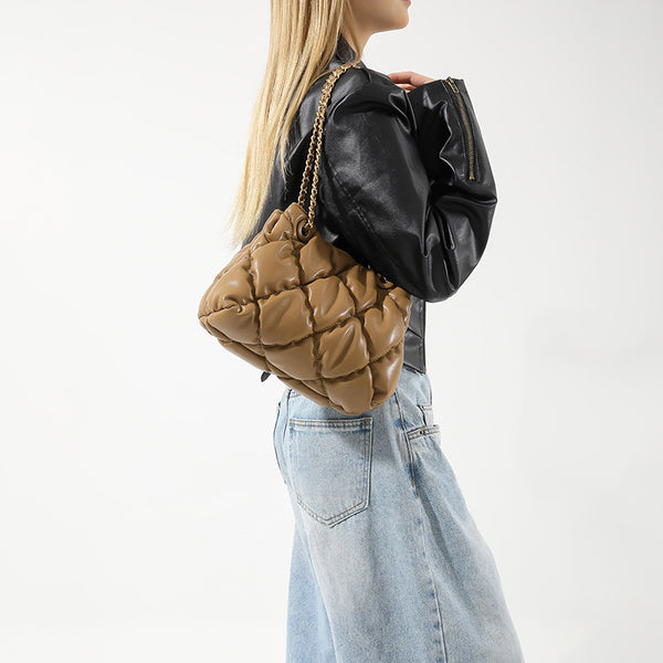 むっちりとしたボリューミーな本体と、華奢でレディなチェーンとのギャップがお洒落なショルダーバッグ。本体サイズに対して大きめのキルティングパターンもユニークです。5色展開の商品ですが、カーキならヴィンテージっぽい雰囲気に。ウォッシュドデニムとも好相性です。