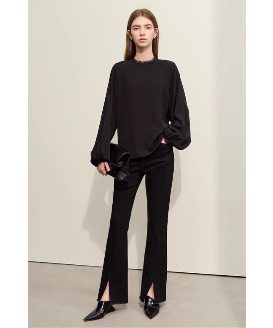 襟元と袖口にレースがあしらわれたブラックトップスは、シンプルながら可愛らしさを感じさせる一枚。ボリュームスリーブが立体感をプラスし、オールブラックでボトムスも揃えることで、統一感のあるシックなモノトーンコーデに仕上がります。シンプルながらディテールで差をつけた、大人の洗練スタイルです。