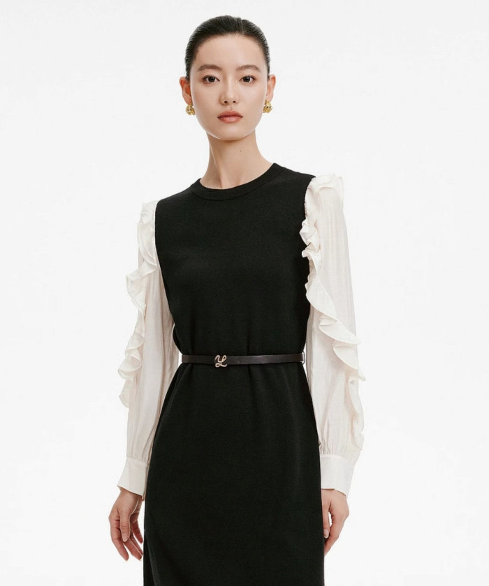 繊細なフリルスリーブが印象的な一着。袖の揺れがキャンドルライトに映えて、手元の所作まで美しく見せてくれます。程よいフィット感と切り替えラインでスタイルアップも叶い、かしこまりすぎず可憐さが欲しい人にぴったり。小ぶりのバッグと華奢なアクセでまとめると、大人の甘さに。