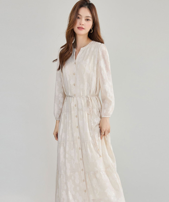 シフォンジャカードの繊細な表情が、派手すぎないのに存在感を放つワンピース。ほどよい透け感と落ち着きある質感が、エレガントで大人の余裕を感じさせます。七分袖で手首が見えるため、ブレスレットやリングとの相性も◎。落ち着いた席・ホテルディナーにもおすすめ。