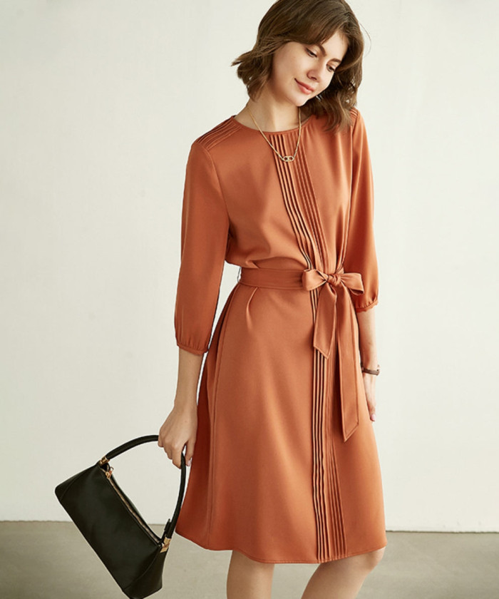 ピンタックと控えめな光沢素材が、女性らしい立体感を引き立てるワンピース。腰位置が高く見えるよう計算された切り替えで、体型を拾いすぎず、自然とスタイルアップできます。動くたびに揺れる生地が華やかさを添えるので、同窓会やホテルランチなど“少しきちんとした場”にもぴったり。羽織りには落ち着いたノーカラーコートを合わせるとより上品にまとまります。