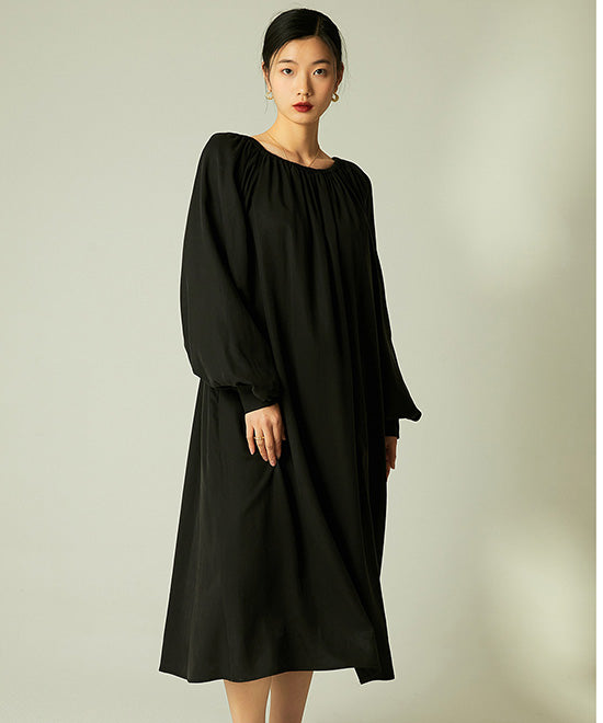 デコルテラインがすっきり、そして綺麗に見えて美しく見せることができるシックでミニマムなワンピース。襟にゴムが入っているので、オフショルダーとして着用することもできますし、アクセサリーを追加したりすれば様々な雰囲気で着用することができます。ミニマムな分、着回し力が高いのです。