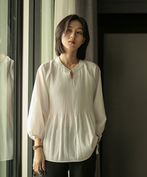 ゆったりとしたシルエットと美しい落ち感が魅力の「ルーズペプラムデザインスリムシフォンシャツ」は、アラ還世代の上品さとこなれ感を両立させる優秀アイテム。バンドカラーが首元をすっきり見せ、自然と縦ラインを強調。ふんわり広がるペプラムは腰位置を高く見せてくれるため、体型の変化が気になる年代にも安心して取り入れられます。