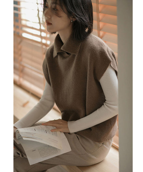 - 華やぎと抜け感を両立する大人のキャメル襟付きベストスタイル