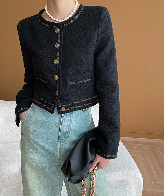 フィッシュボーン柄が上品に映えるブラックのショートジャケットは、コンパクトなシルエットでスタイルアップも叶う優秀アウター。きれいめな雰囲気を持ちながら、デニムパンツを合わせることでほどよいラフさと抜け感が生まれ、日常使いしやすいバランスに仕上がります。