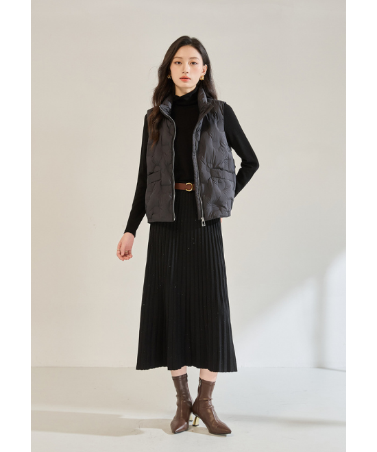 ブラックのニットプリーツスカートとハイネックトップスでつくるワントーンコーデは、上品さもきちんと感も叶う通勤の強い味方。ブラウンのベルトとブーツを合わせることで、黒一色の重さがほどよく和らぎ、季節感のある柔らかなムードが生まれます。落ち着きと華やかさを両立できるこの配色は、忙しい平日の朝でもサッと決まる万能バランスです。