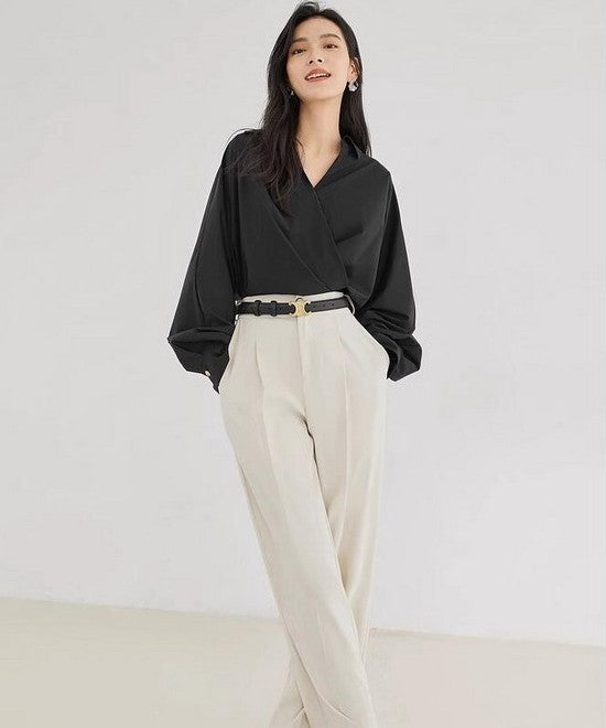 Vネックのデザインシャツは、顔周りをすっきり見せつつ女性らしい抜け感を演出する大人の必須アイテム。ブラックを選べば引き締め効果も抜群で、どんなシーンでも洗練された印象に仕上がります。ホワイトのスラックスと細ベルトを組み合わせることで、シンプルながらも上品でバランスの取れたきれいめコーデが完成。